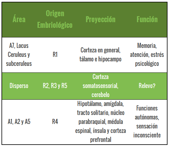 In order to know what the function and distribution of noradrenergic neurons is, we must go back to the moment before birth. When our brain was forming in our mother's womb, several layers called R1, R2, R3, R4 and R5 were formed. There are more, but these are of our current interest because they are the areas affected by Noradrenaline. Formerly the connotation of A1, A2, up to A7 was used to define the areas of the brain affected by Noradrenaline, but recently they discovered that it has more relevance due to its embryological origin. Likewise, in the following table extracted from the EMP Synapse Channel, you will be able to see the location of each area and its function.