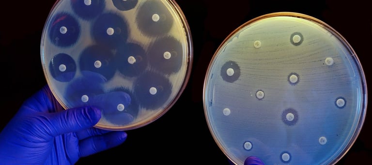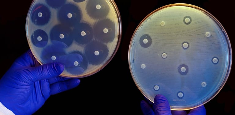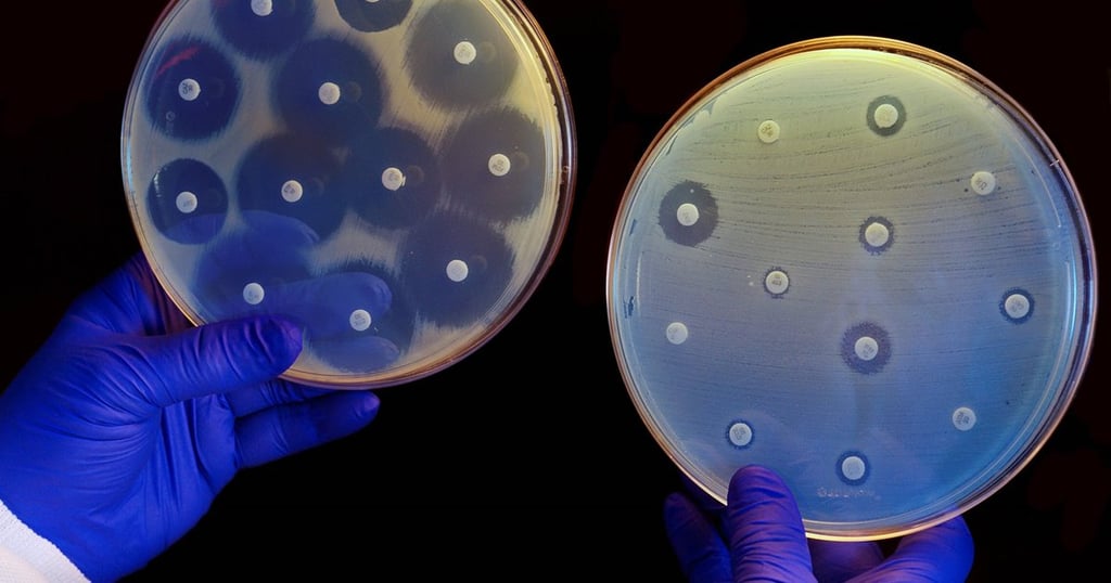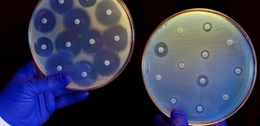 El cultivo de la izquierda no es resistente a los antibióticos de los discos, por lo que no puede crecer cerca de ellos. En el de la derecha se produce el caso contrario. Foto de Corton Press para NatGeo