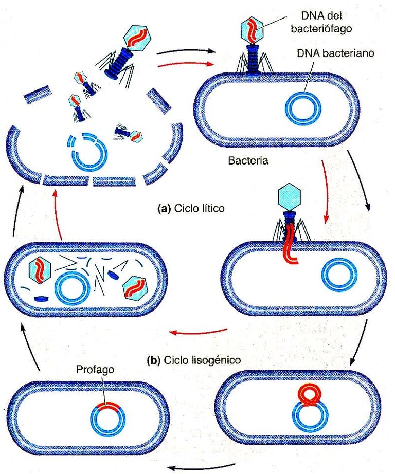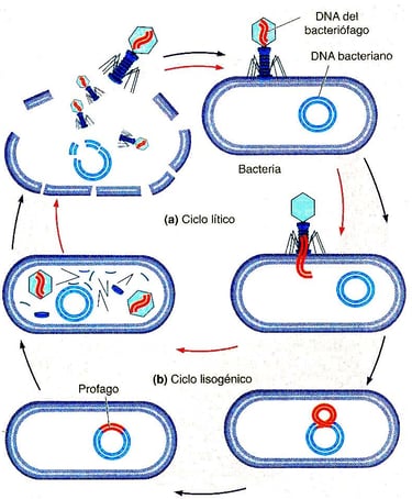 Ciclos de los virus bacteriófagos. Cuando los bacteriófagos infectan bacterias, puede ocurrir uno de los dos mecanismos). a) El DNA viral puede entrar a la célula y comenzar una infección (ciclo lítico) o b)el DNA viral, una vez dentro de la célula, puede incorporarse al cromosoma bacteriano, replicarse con el y transferirse a las células hijas (ciclo lisogénico). Las bacterias que albergan a estos virus se conocen como lisogénicas porque, en forma ocasional, estos virus llamados profagos se activan y establecen un nuevo ciclo lítico. Imagen y explicación extraidos de Blog de Biologia