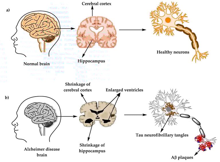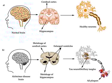 a) La estructura normal del cerebro y b) La estructura de un cerebro con la enfermedad de Alzheimer. Breijyeh, Z., & Karaman, R. (2020). Comprehensive review on Alzheimer’s disease: causes and treatment.