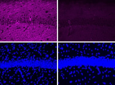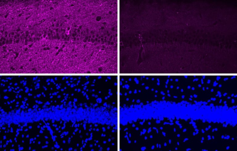 En los cerebros de los ratones tratados con el nuevo péptido (dos paneles de la derecha), se observan muchas menos proteínas Tau (teñidas de púrpura) en la parte superior derecha. Los paneles de la izquierda muestran neuronas de ratones tratados con una versión codificada del péptido. En los dos paneles inferiores, el ADN de los núcleos celulares se tiñe de azul, lo que muestra que los cambios en los niveles de Tau no son causados por cambios significativos en la población celular. Crédito: Ping-Chieh Pao para MIT News